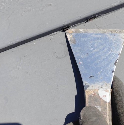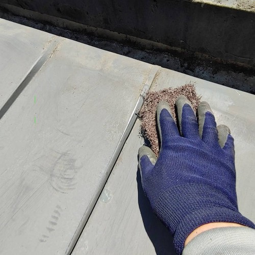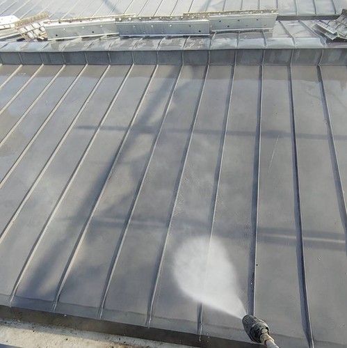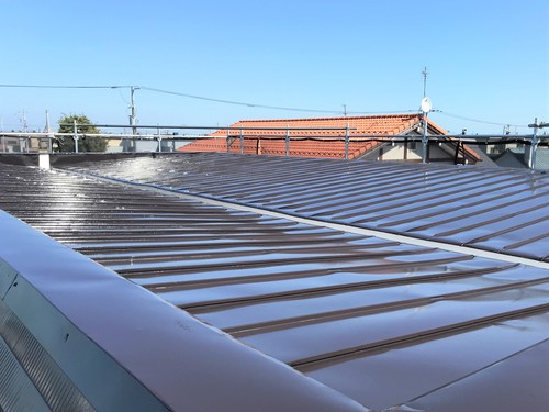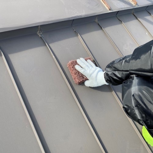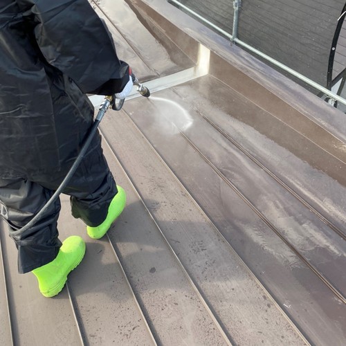 飛散防止ネット設置⇒ハゼ締め⇒屋根ケレン作業⇒外壁・屋根高圧洗浄を行いました。