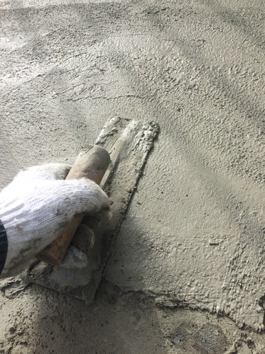 ベランダ防水工事。樹脂モルタルで勾配調整施工中。