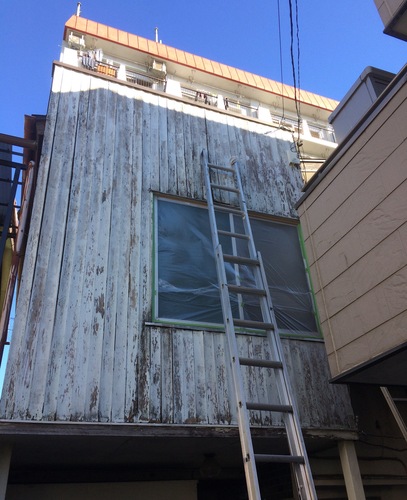既存下地の下見板が悪い状態でのフッ素塗料仕上げ。施工前。