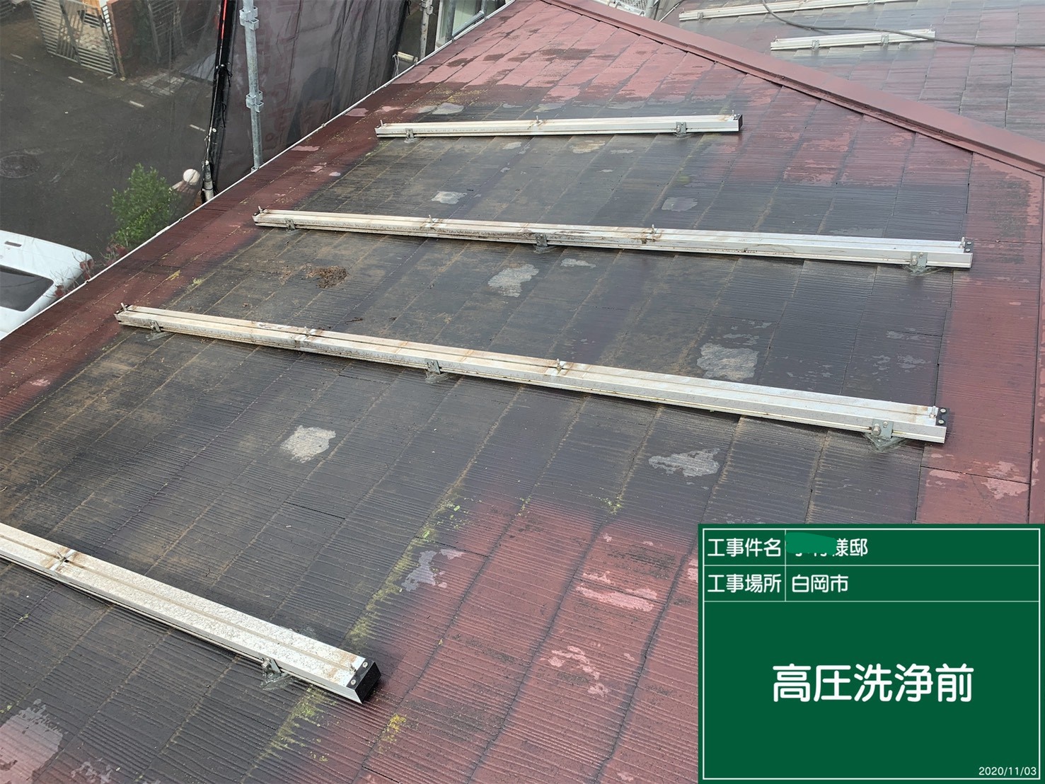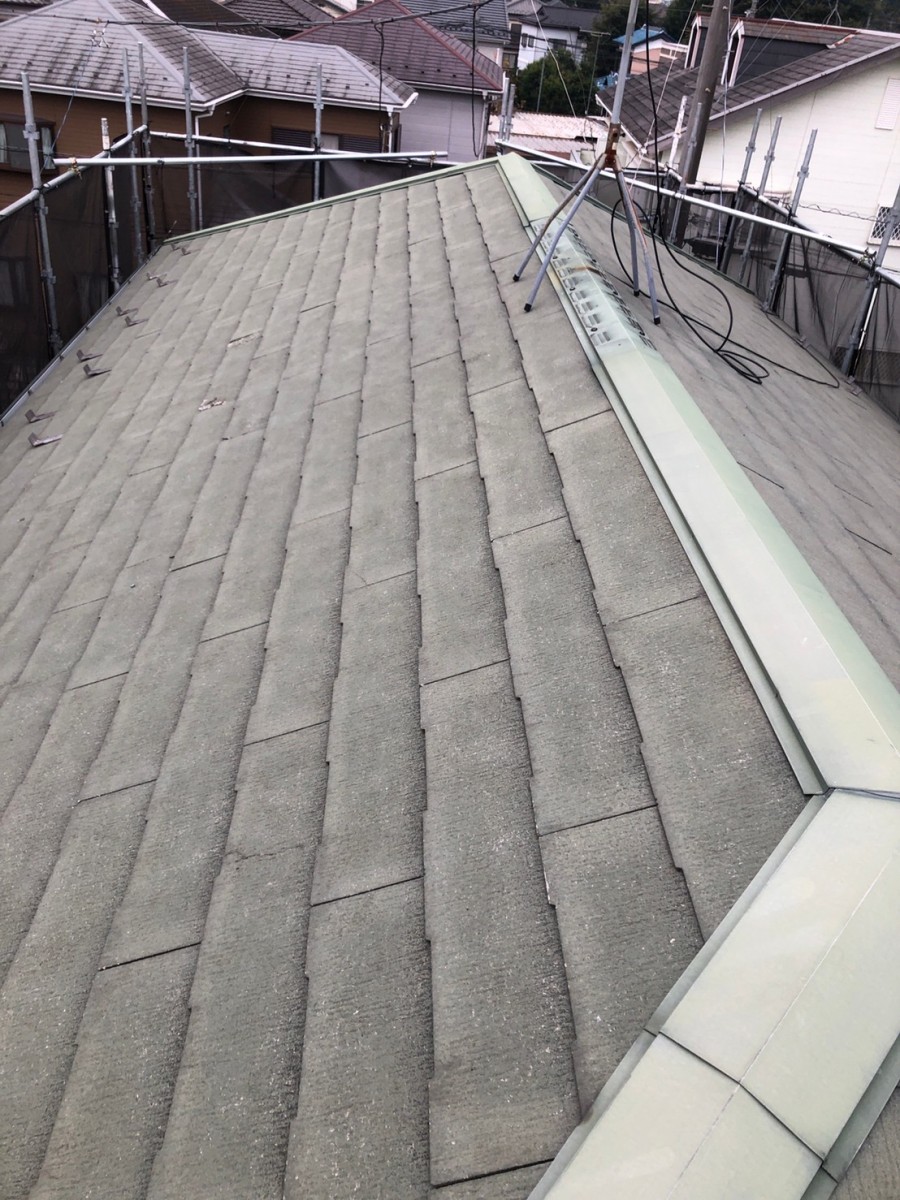 屋根外壁塗装工事 太陽光パネル取り外し屋根塗装します。当然塗装完了後パネル取り付けします。一般的にパネルは取り付けしたまま手の届く所まで塗って終わりです。弊社は脱着します。