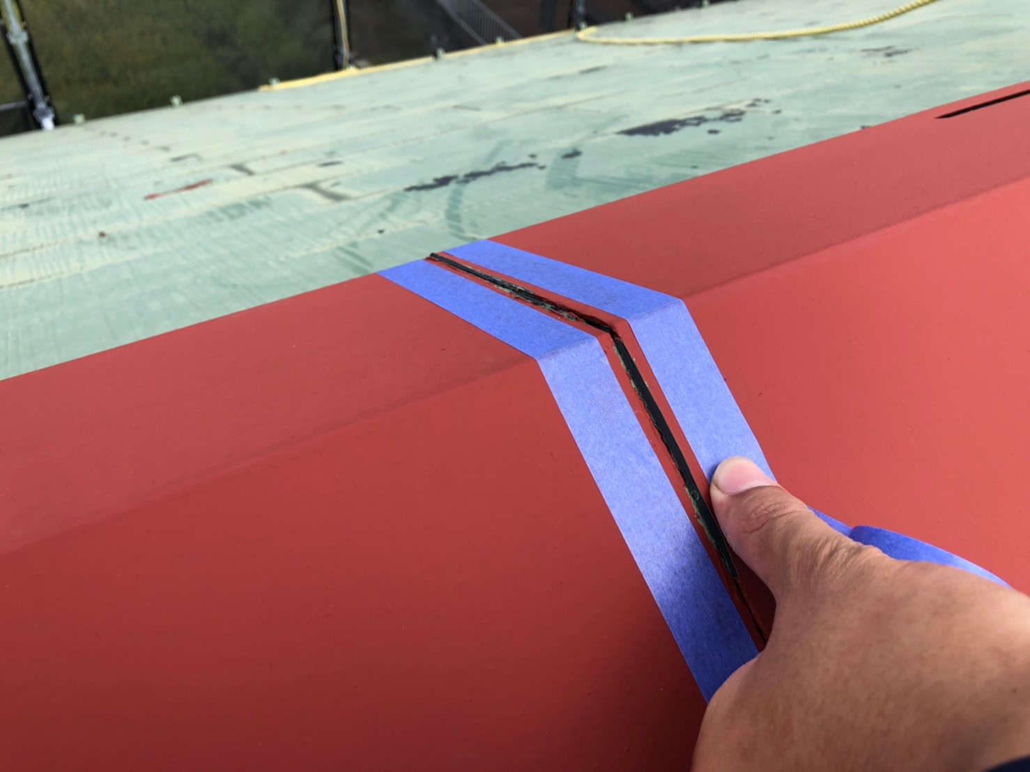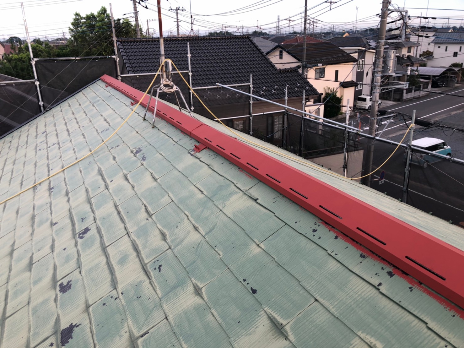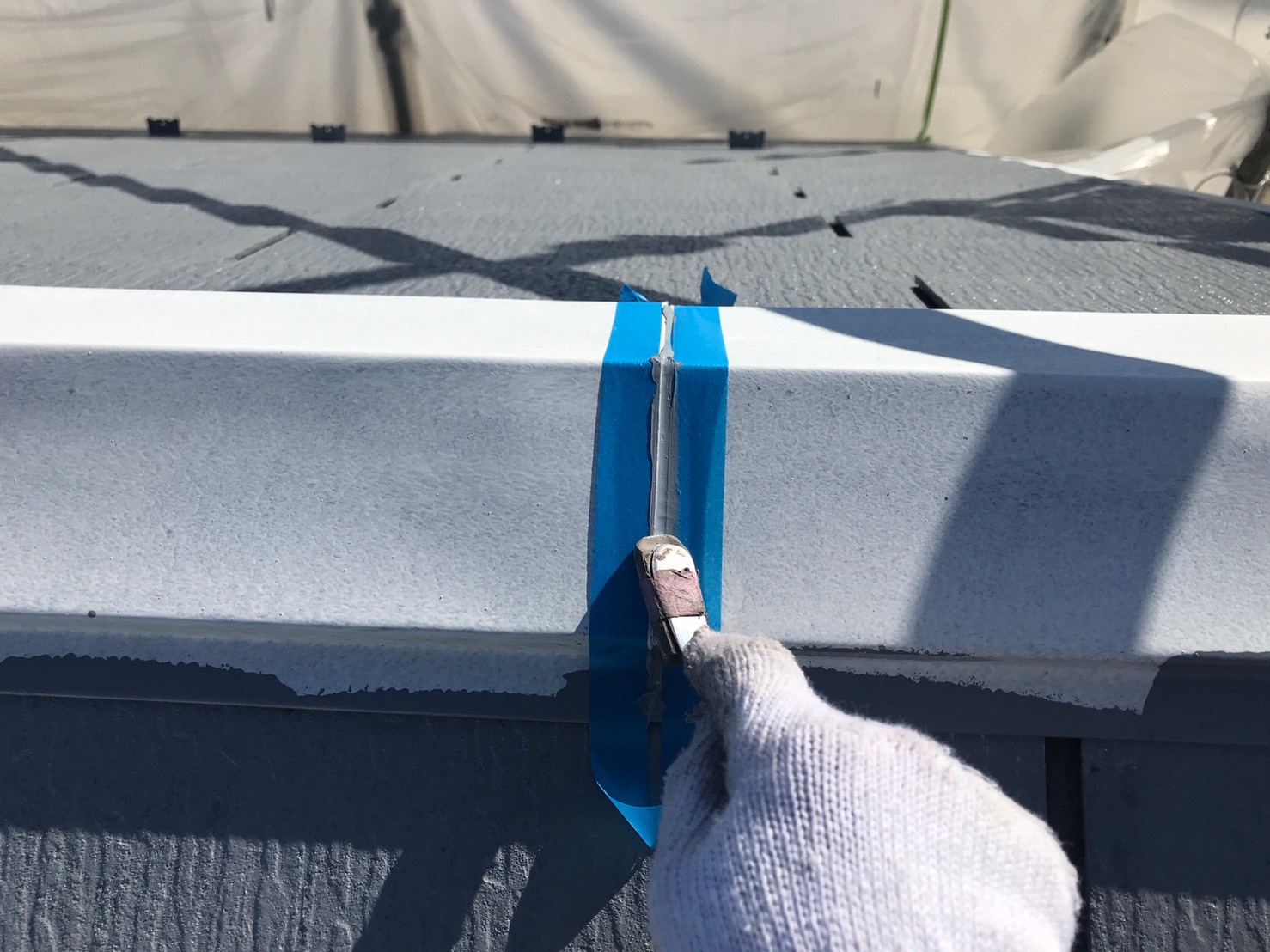 屋根は高圧バイオ洗浄です。 棟板金つなぎ目コーキング、ビス頭コーキング。