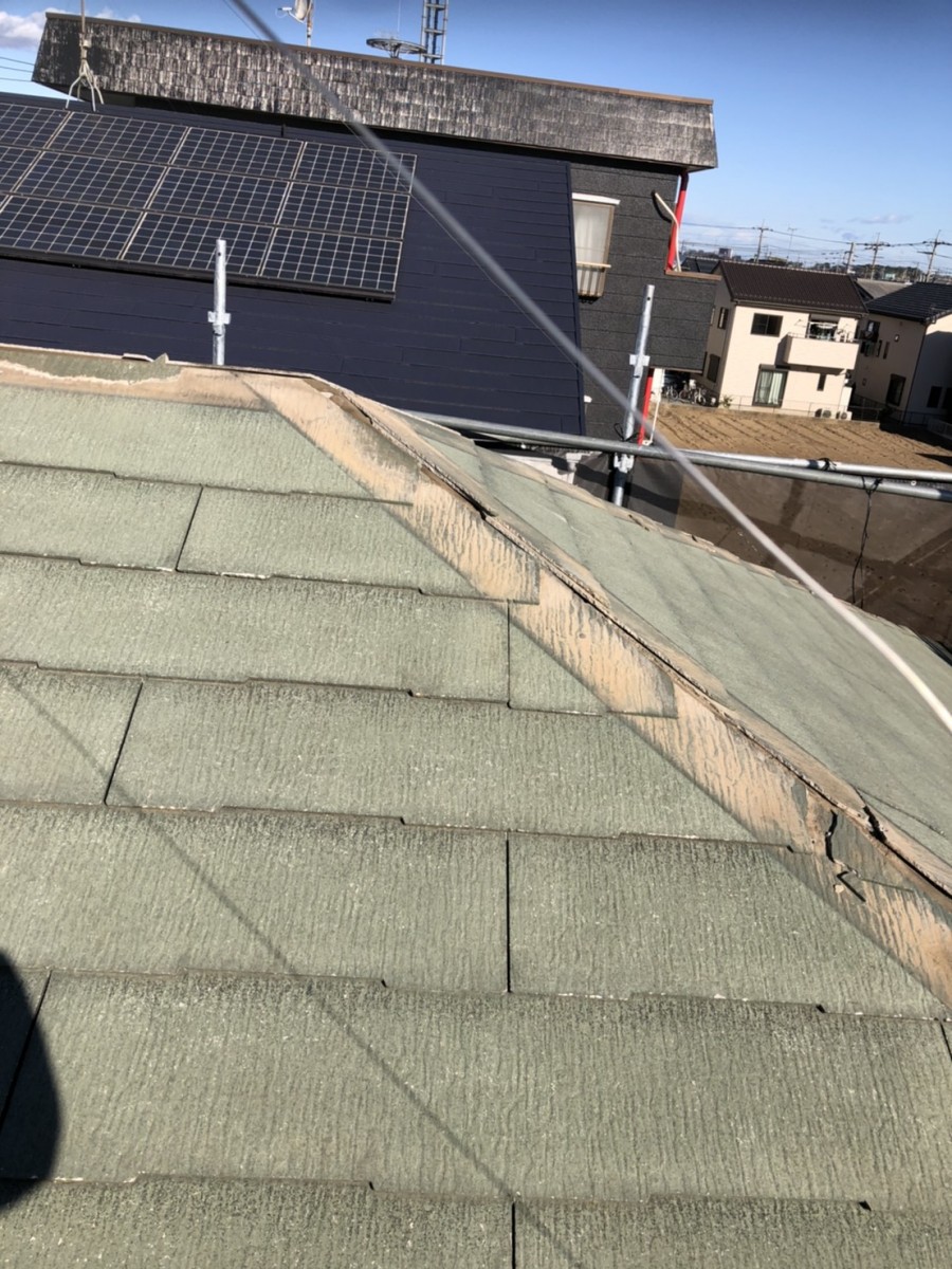 こちらのお宅は築20年で、屋根材は化粧スレート(コロニアル)を使用していますが、経年劣化により色褪せやひび割れが多く見られます。