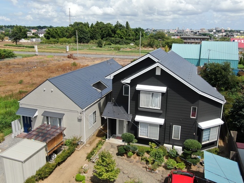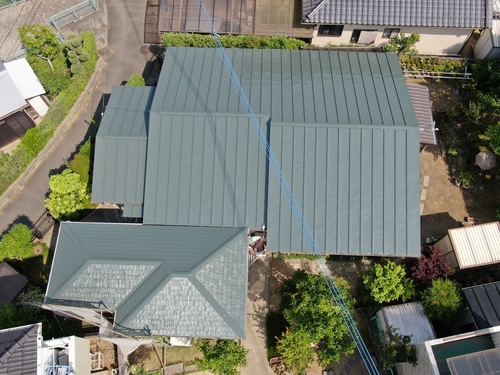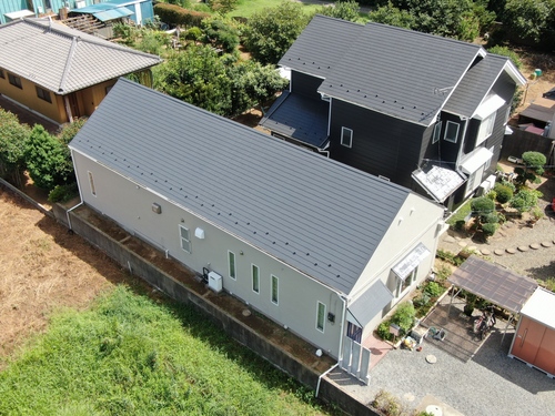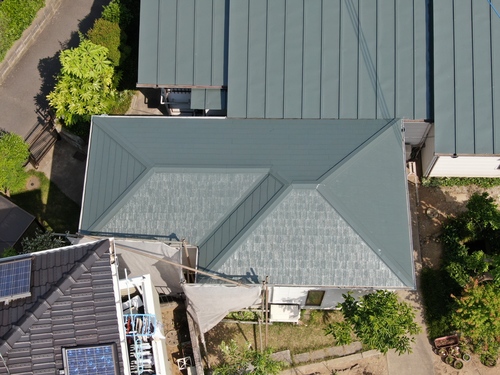 本日、屋根塗装が完了しお客様立会いのもと、ドローンで写真を撮ってみました。