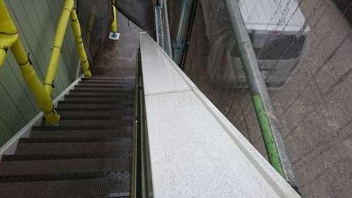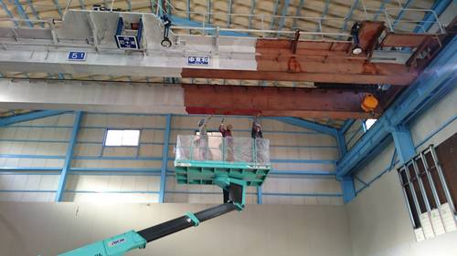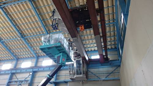 現在は高所作業車を使用して残りのクレーンの架台を塗装しています。