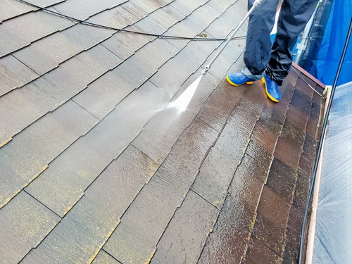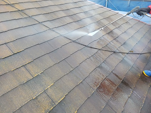 足場の設置が完了しましたので高圧洗浄をしました。外壁・屋根の汚れを洗い流してから塗装します。