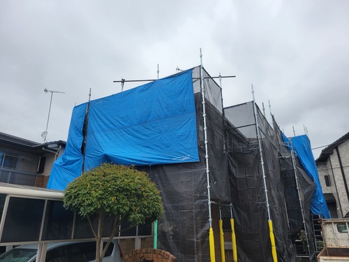 足場にも汚れが飛ばないように、ブルーシート養生致します。