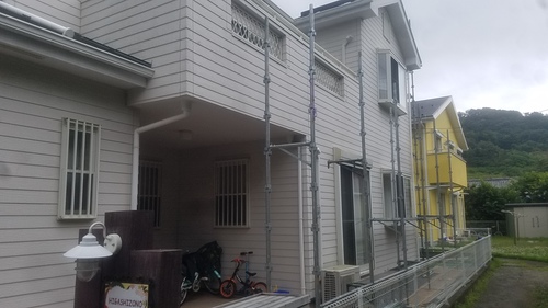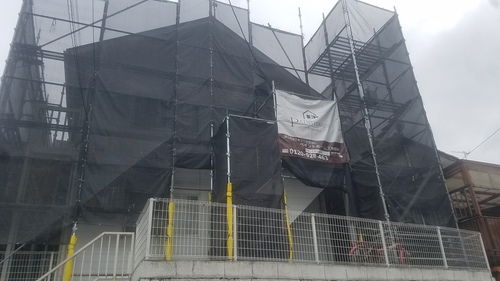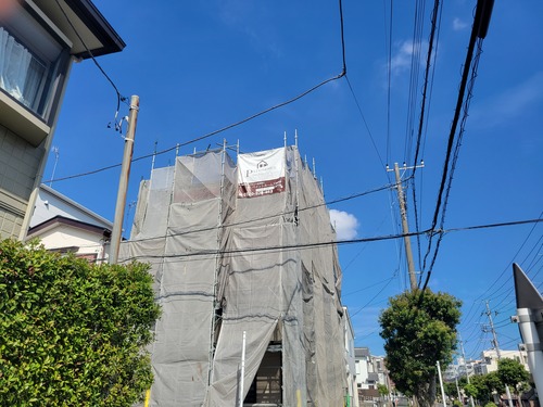平塚市で外壁塗装工事がスタートしました。まずは足場の設置です。