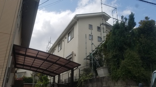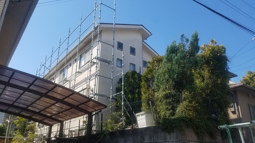 以前、工事をさせていただきましたお客様よりご紹介していただきました。本日より外壁塗装工事がスタートしました。足場の設置からです。