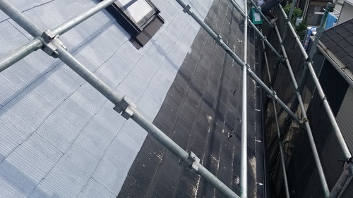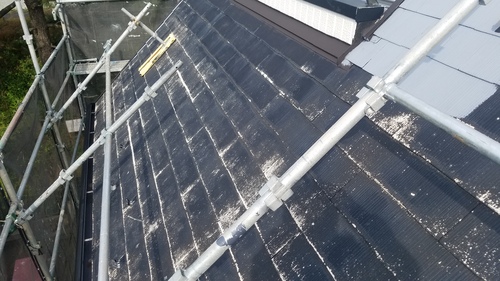 屋根の勾配がきついため屋根に足場を組んでの作業です。