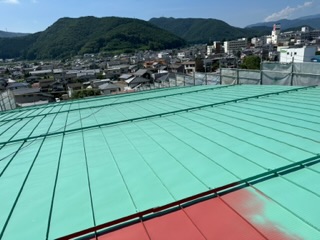 本日は塩尻市内にある小学校の屋根塗装をおこなっています!炎天下の中での作業は危険もありますが、水分と休息をしっかり取り作業を進めています(^^)