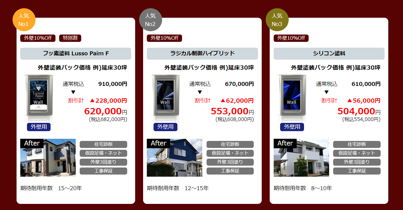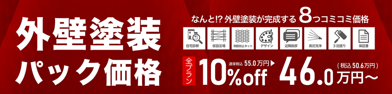 現在ペイントホームズでは、外壁塗装パック価格「10%オフ」の