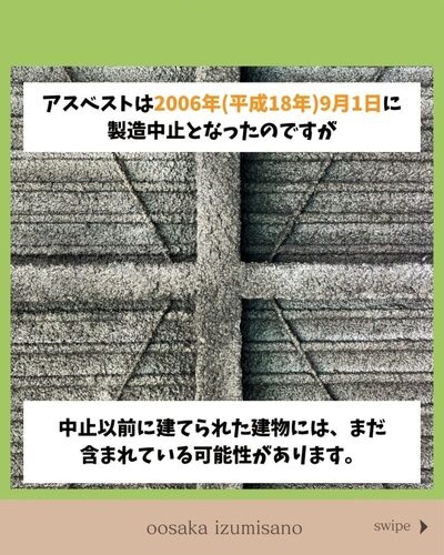 アスベストは2006年(平成18年)9月1日に製造中止となったのですが中止以前に建てられた建物には、まだ含まれている可能性があります。