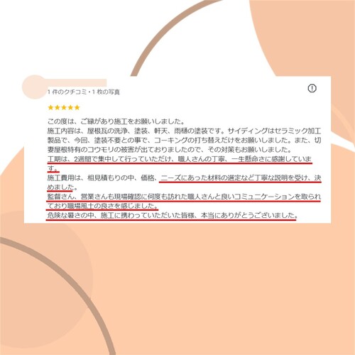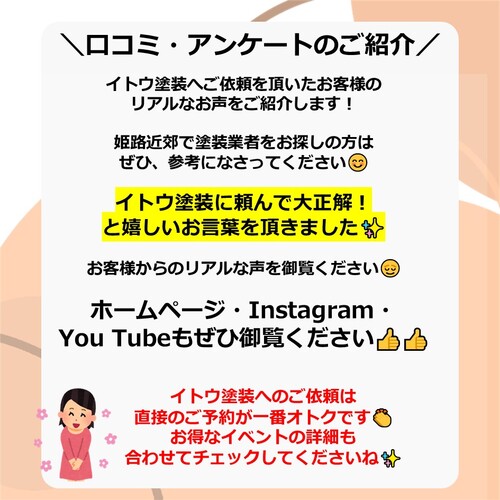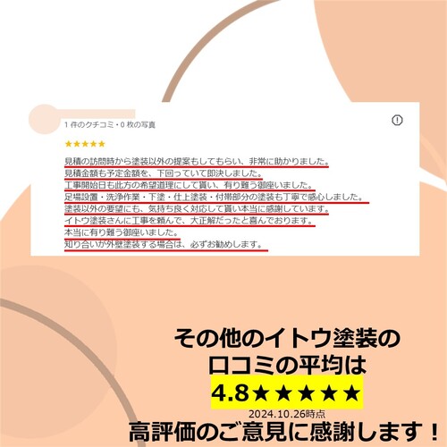 これから外壁塗装屋根塗装を考えられる方は是非、業者選びの選択の際に今回のアンケート・口コミをご参考頂けますと幸いです😊