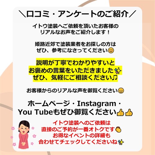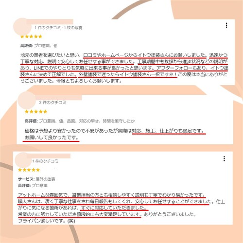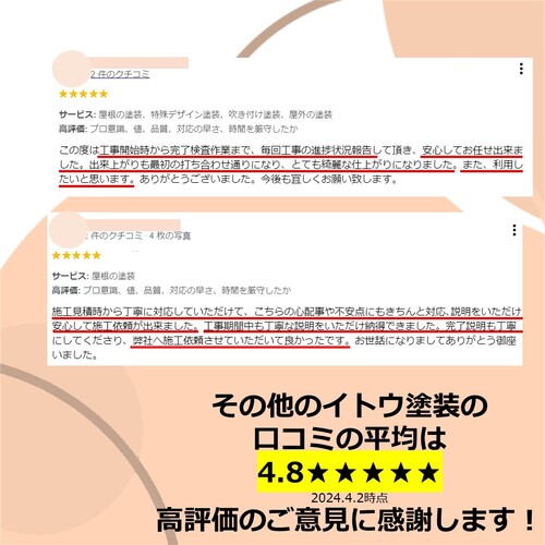これから外壁塗装屋根塗装を考えられる方は是非、業者選びの選択の際に今回のアンケート・口コミをご参考頂けますと幸いです😊
