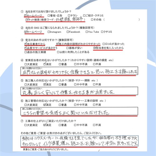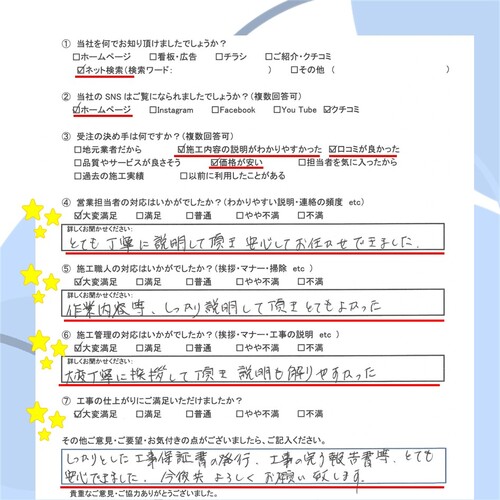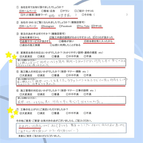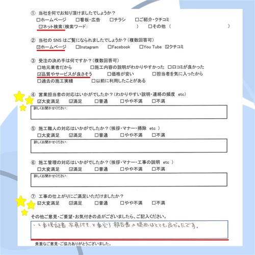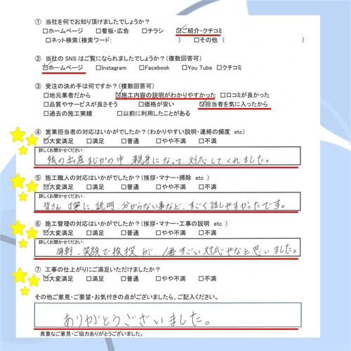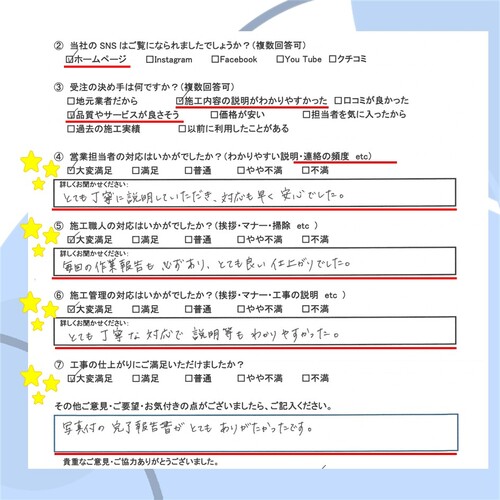 先日、お手伝いさせて頂いた施工主様から嬉しいアンケートをご記入いただけましたのでご紹介させて頂きます!