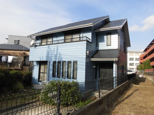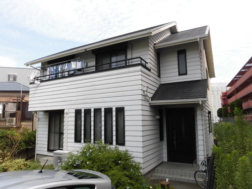 えー、M様邸ですが、施工前の写真、真っ白なお家に見えますが、元々は青いお家だったみたいで、それを聞いた時は「えーーーっ!?」と声を上げて驚いてしまいました(笑)