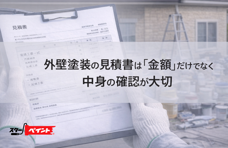外壁塗装の見積書は、単なる金額表ではなく、どのような工事を、どこまで、どんな材料で行うのかを確認するための大切な資料です。内容をしっかり確認することで、工事の質や提案の丁寧さも見えてきます。見積書は、塗装会社によって項目の出し方や表現が異なります。そのため、金額だけを見て「安い」「高い」と判断すると失敗しやすくなります。たとえば、一見安く見える見積書でも、高圧洗浄や下地補修、シーリング工事などが十分に入っていない場合があります。
