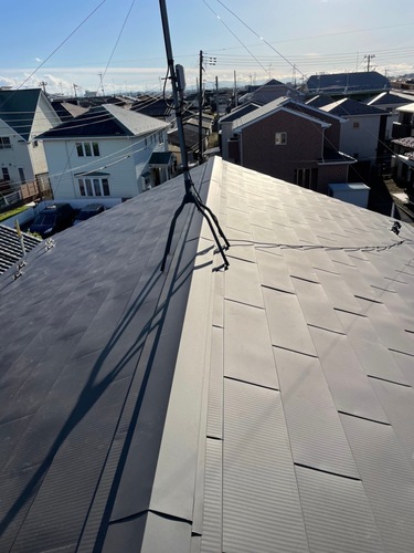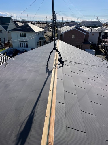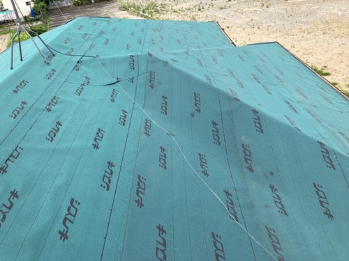 屋根工事は、屋根材からの照り返しで、サウナ状態です。メタボ気味の我々には丁度いいのか(笑い)。雨になる前に工事ガンガン進めて行きます!