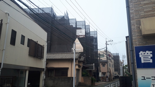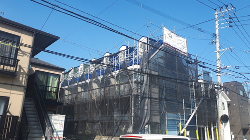 本日西区5階建てアパート改修工事に伴う足場の設置が完了致しました。