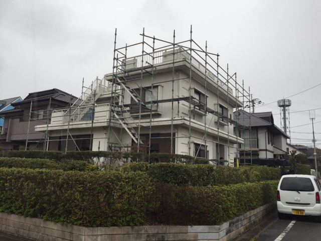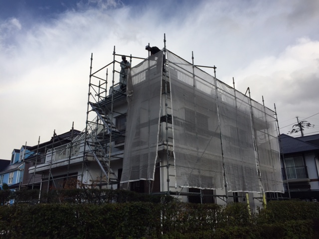 筑紫野市にて高圧洗浄を行いました♪まず始めに足場にメッシュシートを張っていきました。この作業は塗料の他に、水しぶきの飛散を防ぎ、お隣さまの洗濯物を濡らさないようにする大切な役割を果たしてくれますではその様子をご覧いただきましょう★
