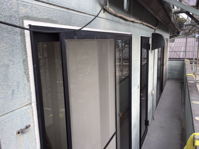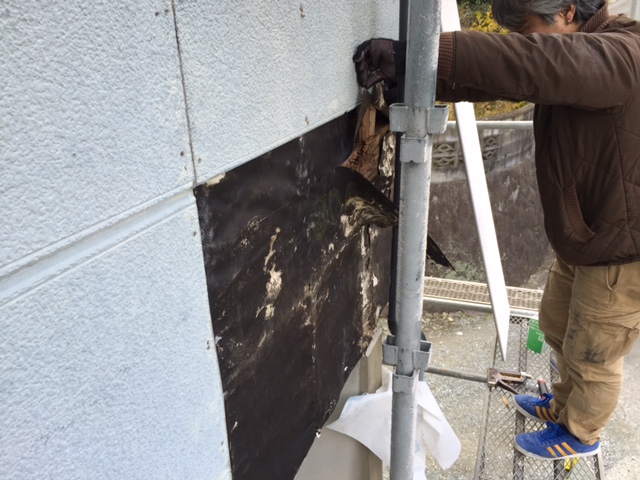 紫外線や雨水の影響による経年劣化で、外壁やコーキング目地に剥がれ、ひび割れ現象が見受けられますので、まず始めに塗装の長持ちの決め手となる下地処理をキッチリ行っていく予定です!