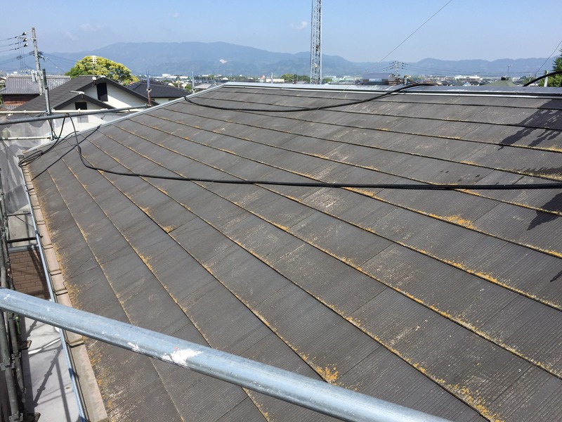 屋根瓦にコケや藻が付着している状態でした。建物周辺に林があり、こういった周辺環境ではコケや藻が発生しやすいです。そのため今回は、防藻・防カビ効果のある塗料を使用します。