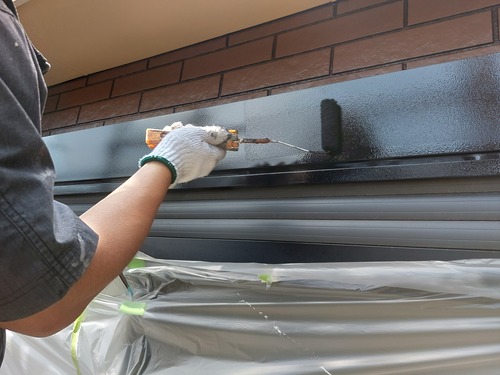 本日は水切り上塗り一回目、二回目 縦樋、庇、シャッターボックス上塗り 下屋根上塗り作業を行いました。