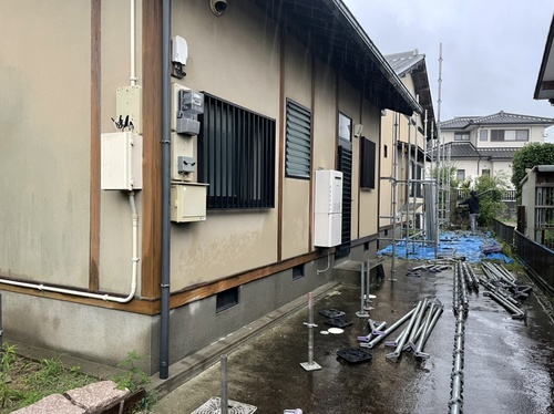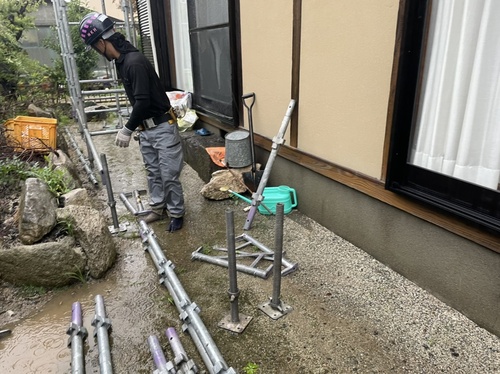 今日から久留米市のF邸で足場組立てが始まります^ ^着工です!!午前中は久留米は大雨でした!職人さんたちも雨合羽も着用せずにずぶ濡れでした(T ^ T)