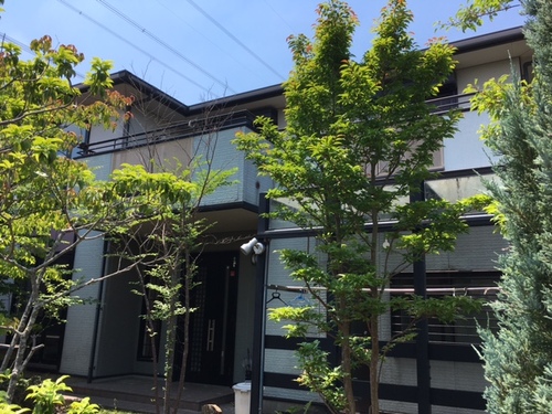 ライトグレーからダークブラウンに変わりシックなイメージになりました!また玄関廻りをオフホワイトにして玄関ドアと天井材を木目調に変えることで、建物の雰囲気を大きく変えることができました☆