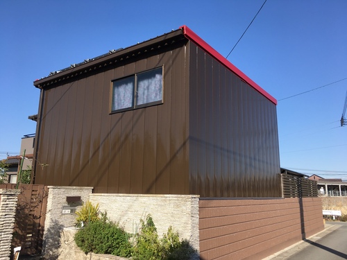 塗料の艶が太陽の光に反射してピッカピカの建物になりました☆彡倉庫のワンポイントの赤が可愛らしいですね![]()