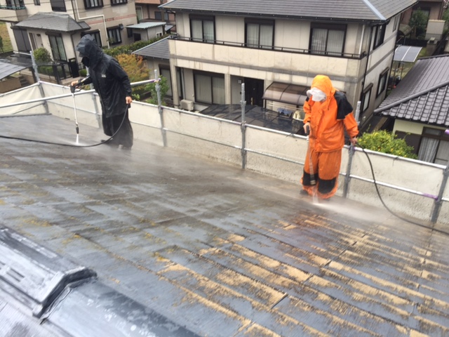 屋根、外壁共にコケ、藻、汚れの付着が見受けられましたので、高圧洗浄の水圧で一気に洗い落としていきました。この作業が塗料の密着と綺麗さを持続させる大切な作業になりますので、隅々まで念入に施工させて頂きました!
