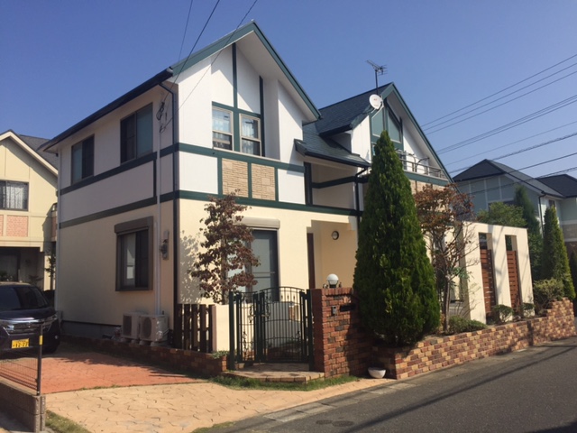 いかがでしょうか♪ご覧の通り、明るく品のあるお家に生まれ変わりました✩今回の色はお客様のご要望の「明るいイメージにしたい」とのことから、屋根と付帯は淡いグリーン、外壁色はアイボリーとホワイトの2トーンカラーになりました✩こちらの色の組み合わせは僕個人としても非常に好きな色合いです✩離れて見ますと色が明るくなったため、建物がより大きく見えます♪実に良いですね♪