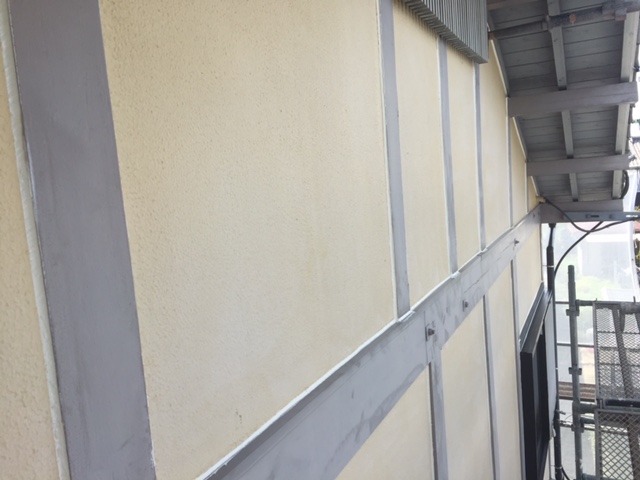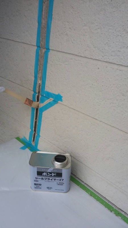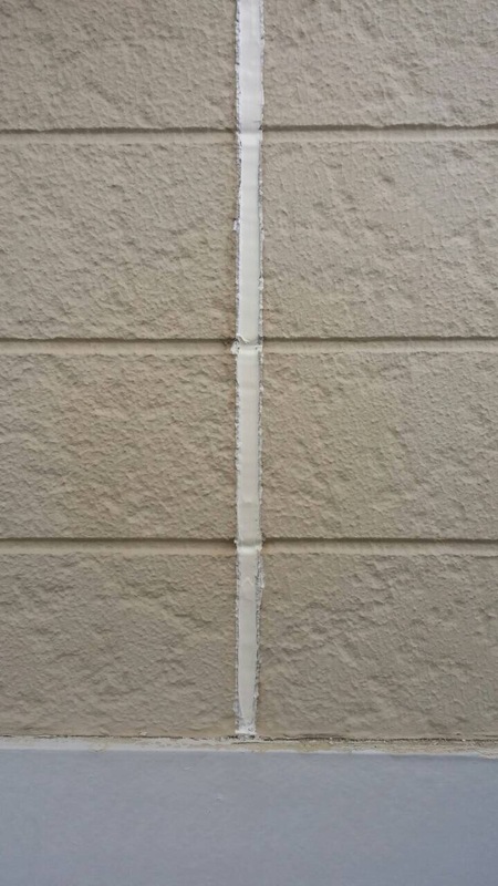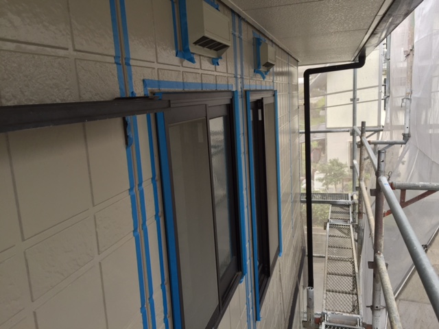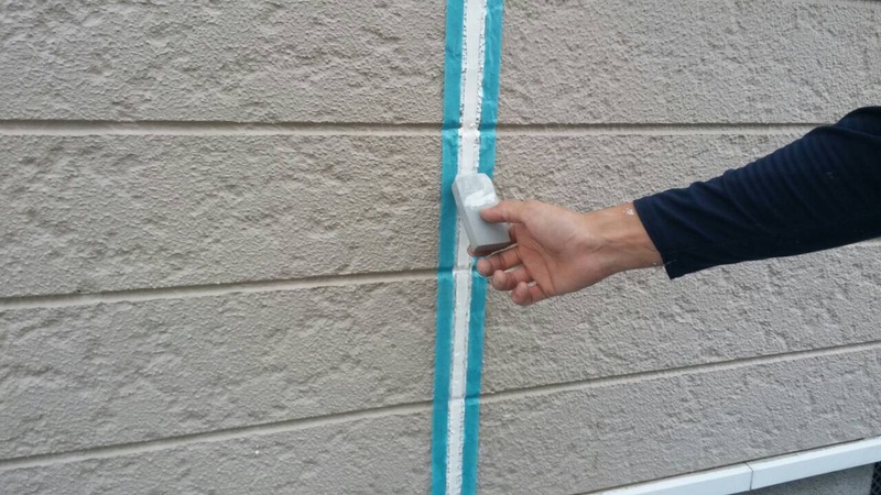 マスキング養生後、隅々までコーキングを充填していきました。来週から塗装を行い外壁に防水効果を与えていきますので、これでご安心頂けると思いますヽ(´▽`)/来週は外壁の下地処理(ひび割れ、ケレンなど)や下塗り塗装を進めていく予定です。
