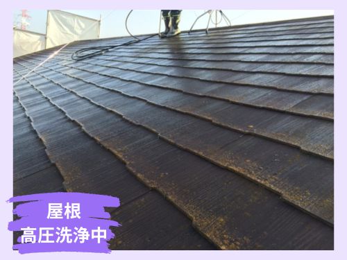 水戸市で行った屋根塗装の下地処理での高圧洗浄作業をご紹介します! 塗装の品質を決める大切な工程が、この高圧洗浄です! 屋根の高圧洗浄では、汚れや古い塗膜をしっかりと落として、 塗