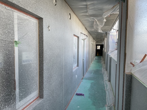 茨城県にて集合住宅の新築吹付塗装工事をしております。