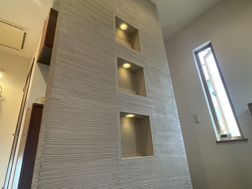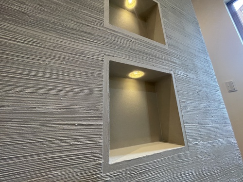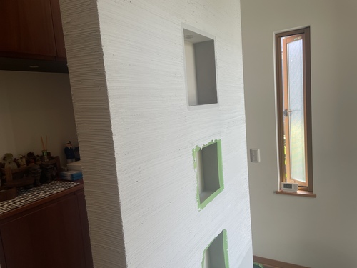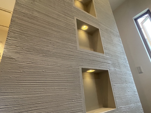 壁の方はクロスの上から下処理をして大きめの寒水石を入れたジョリパッドでボリューム感を出した仕上げになりました。