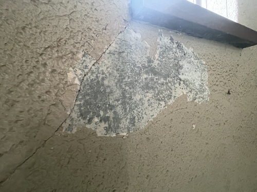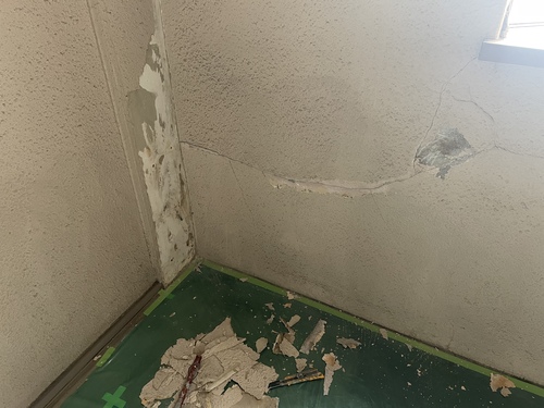 恐らく、外部屋上の防水シートか外壁から雨漏りが発生しているような感じで鉄骨を伝い、内部の壁に内側から入り、爆裂がおきていると考えます。