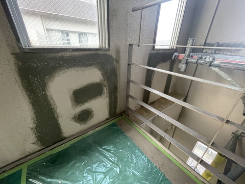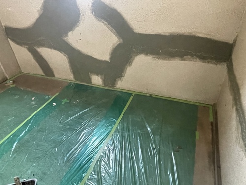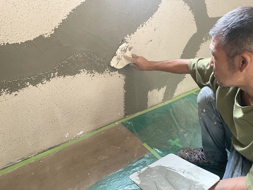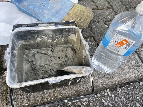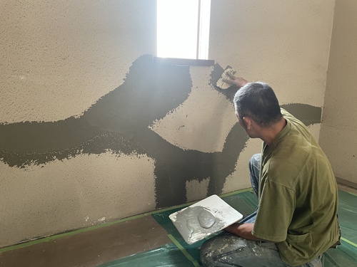 ジョリパッド1回目をベース塗りしてより平らにして、2回目に塗るジョリパッドが透けないよう、ひっかかりやすくするためジョリパッド1回目を施工した後