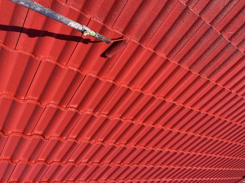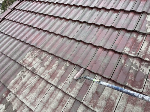 苔や汚れ、塗膜の浮き、モニエル瓦のスラリー層をしっかりと高圧洗浄で除去し、モニエル瓦用のプライマーを下塗りをします。