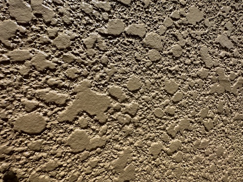 外壁の塗り替えには注意が必要で凹凸が激しく下塗りでムラなく塗り潰し、上塗りする前に十分乾燥させる必要があります。下塗りの選定が非常に大事で塗りムラや乾燥不足で上塗りをかけると空気が入り気泡が発生して膨れて剥離する恐れがあります。通常、モルタル下地の吹付模様の時は微弾性フィラーで目止めしますが、目視でわかりにくい内部まで下塗りを浸透させたいので、カチオン系エポキシシーラーで浸透させ固めます。各メーカー様により施工方法や材料は違いますが、まずは浸透性のあるシーラーで下塗りするか、カチオン系のポリマーセメントフィラーで下塗りするのをおすすめします。また、クラック部に追従する弾性下塗り材も凹凸の凹んでる面に材料が厚く溜まり、太陽光の熱膨張により膨れる可能性があるので推薦しません。