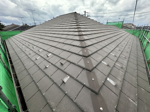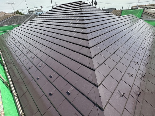 セミフロンスーパールーフ遮熱で、遮熱の無機塗料になります。色はコーヒーブラウンで新築時のような仕上がりに生まれ変わりました。