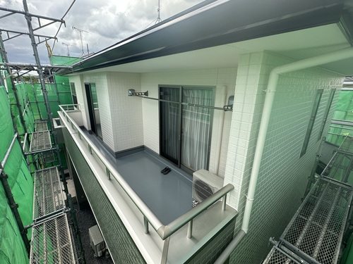 外壁サイディング目地は高耐久のオートンイクシードで施工し、ベランダの防水面もピカピカに生まれ変わりました。