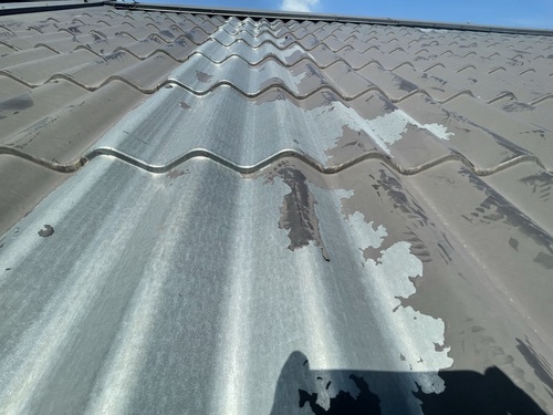鋼板の上に塩ビシートが貼ってあり、劣化すると塩ビシートが浮きあがり、下地の鋼板がみえます。