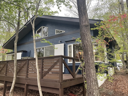 外壁の紺色と白冊子の相性が抜群でウッドデッキの茶色とも雰囲気が合い、どこか外国の建物のような感じです。