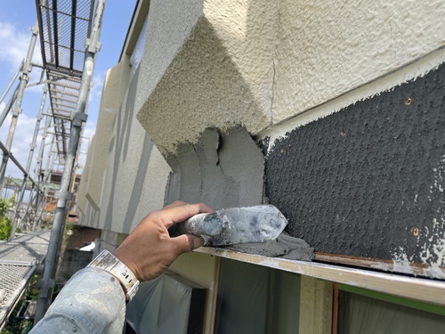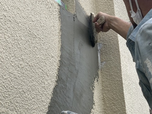 クラック処理はVカットをし、ウレタンパテを重鎮後カチオン系モルタル材で平らにします。